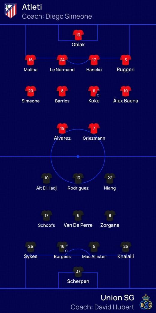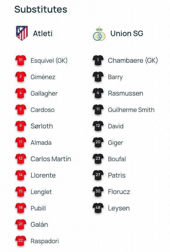 馬德里競技首發:3-魯杰里、6-科克、7-格列茲曼、8-巴勃羅-巴里奧斯、10-巴埃納、13-奧布拉克、16-莫利納、17-漢茨科、19-胡利安-阿爾瓦雷斯、20-朱利亞諾-西蒙尼、24-勒諾爾芒